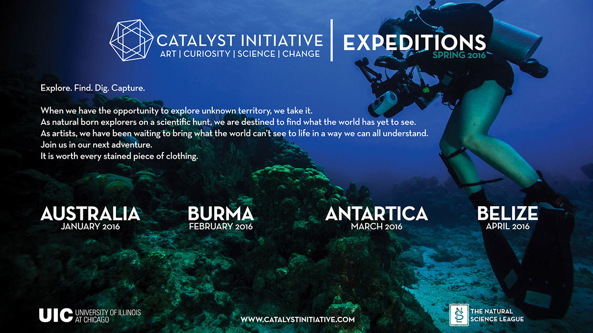 SOLUTION Bring emerging artists along for the ride. Together, these young minds will make the invisible visible. We created a college organization called "Catalyst Initiative" to explain the ASP and build relationships with college students. The Initiative consists of series of lectures, semesterly expeditions and gallery exhibits.